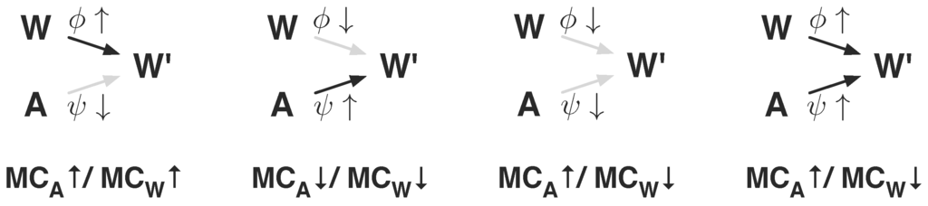 The fourth case is similar to the third case if the world state W is not equivalent to the action A, because in this case the next world state is independent of both. We saw from the third case that this leads to and . If the action A and the world state W are equal, the first measure reduces the amount of morphological computation, whereas the second measure increases the amount of morphological computation, leading to and .