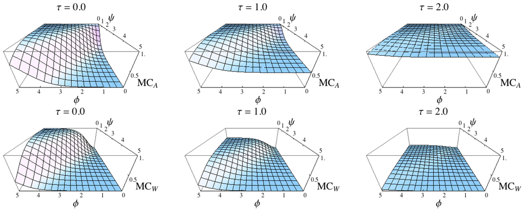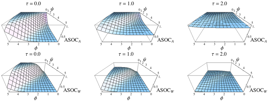 The four cases are identical with the four corners of the φ–ψ plane in Figure 9, and the four cases are well-reflected in the plots. The plots also visualise the difference of the two concepts for the last two cases (, and , in Figure 9).