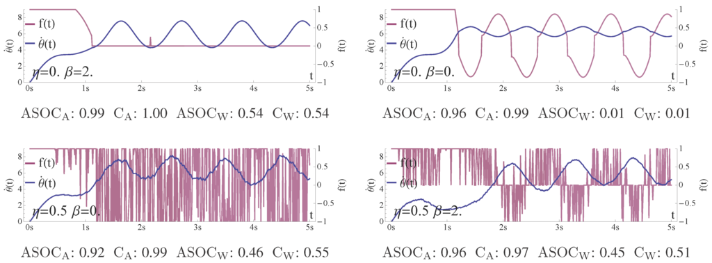 where is the force imposed by the controller (see below), γ is the friction coefficient, is the current angle of the pendulum, m is its point mass that is located from the centre by the length l. Equation (36) was numerically solved for using the NDSolve method of Mathematica 8.0 [15]. The actions were modified only for , and kept constant while Equation (36) was solved. This refers to a behaviour update frequency of 100 Hz. The controller is defined by the following set of equations: