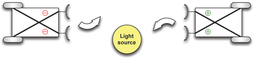Braitenberg Vehicle 3. The figure shows two Braitenberg vehicles, each equipped with two light sensors and two actuators. The polarity of the sensor-motor couplings determines the behaviour. The Braitenberg vehicle on the left-hand side is repelled by light, whereas the Braitenberg vehicle on the right-hand side is attracted by light.