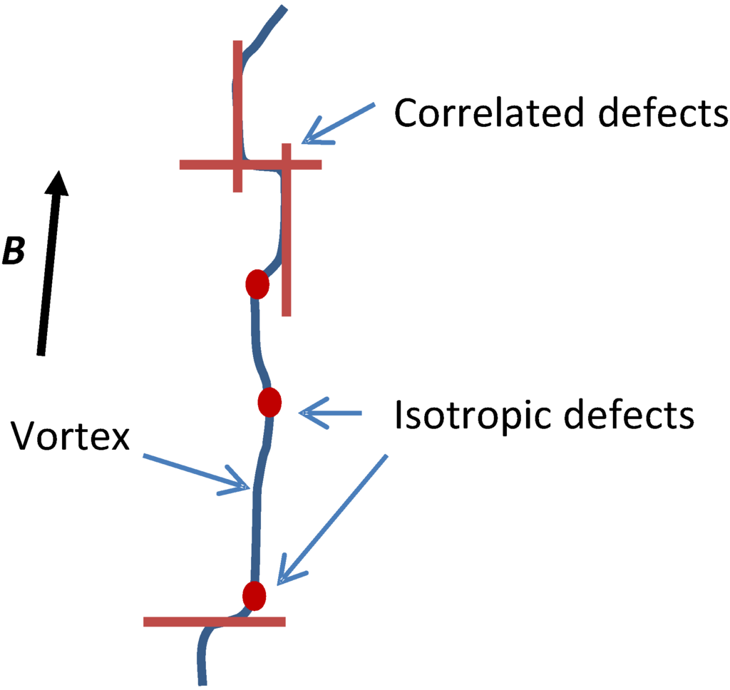 From a physics perspective we wish to connect critical currents with magnetic flux vortex behavior [,,,]. Flux vortices are the quantized magnetic fluxons which penetrate type II superconductors subjected to an applied magnetic field. They are whirlpools of supercurrents surrounding a non-superconducting core and can be modeled as elastic strings threading through the superconductor in global alignment with the macroscopic field direction. Vortices will preferentially align themselves with pre-existing non-superconducting regions of the material (e.g., material defects) so as to lower the total free energy of the system. This preferential alignment with a non-superconducting region is termed “pinning”. It requires a force of order ΔU/2ξ to dislodge a vortex from a pinned position, where ΔU is the difference in condensation energy between the pinned and free vortex and 2ξ is the lateral dimension of the vortex core. When vortices move, energy is dissipated in the sample, ultimately leading to a loss of superconductivity. For high critical currents to be achieved, vortices must remain immobile or “pinned” in the material.