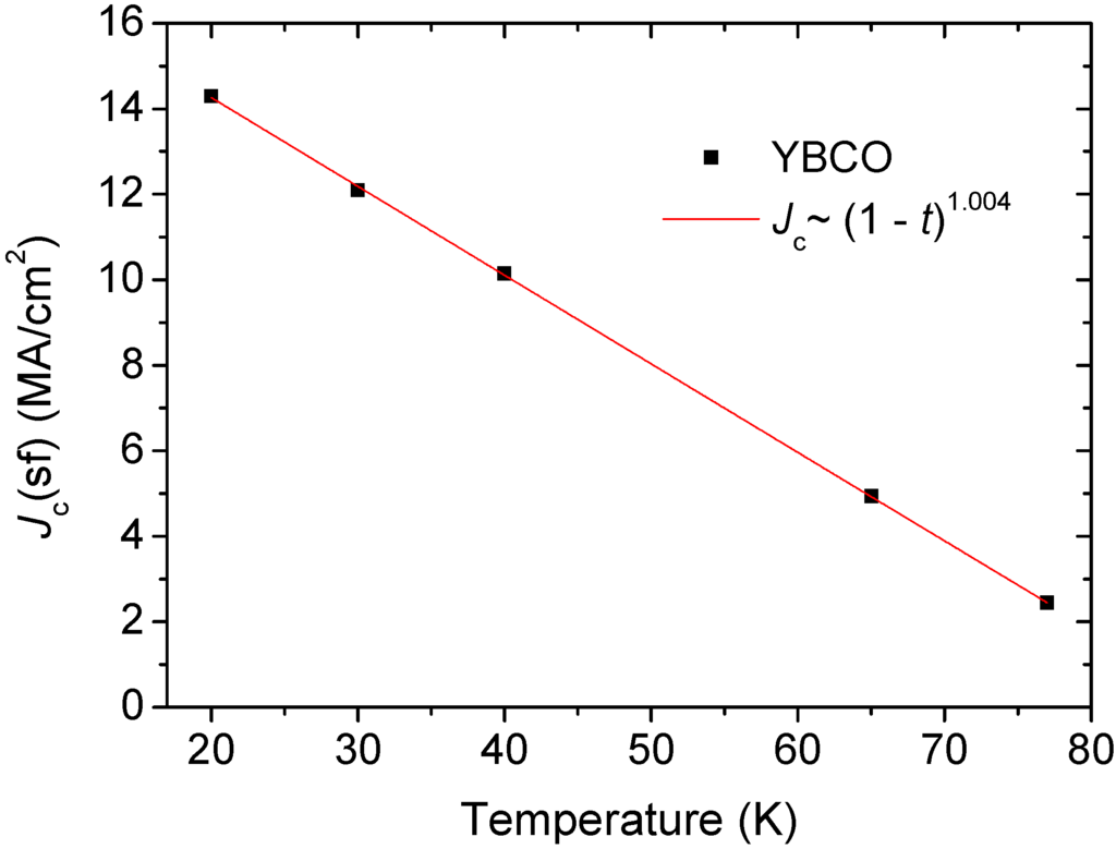 Jc(T) for a metal-organic deposited YBCO thin film, 1 μm thickness.