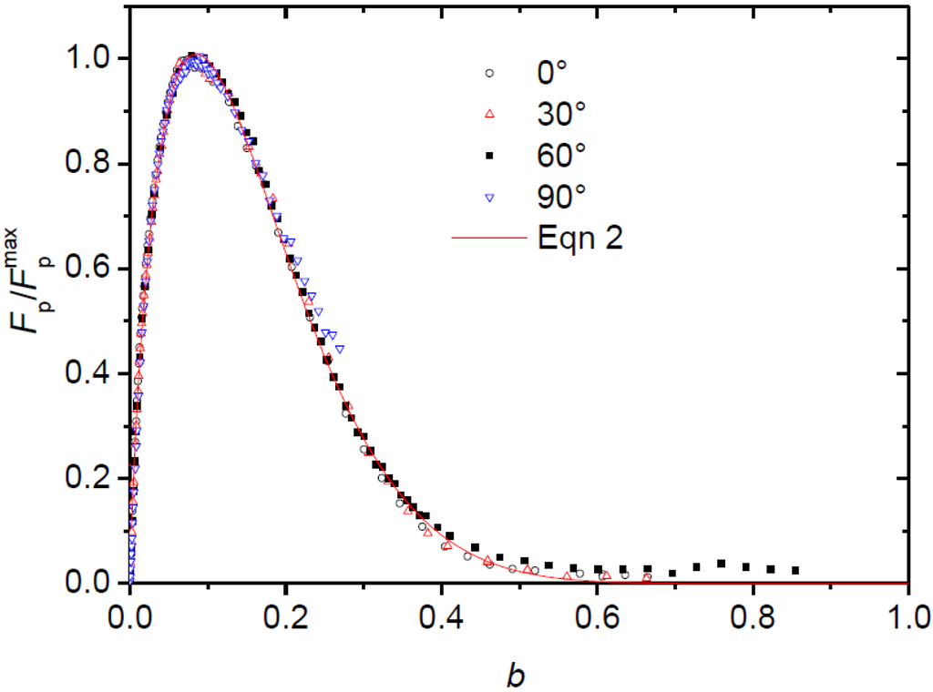 Flux pinning force as a function of applied field for a Bi-2223 wire sample measured at 77 K. The data for 4 different field angles, θ = 0 (perpendicular field), 30°, 60° and 90° (parallel field) are scaled to lie on a common curve. The Beta distribution parameters used to fit the common curve are, α=1.8, β = 9.6.