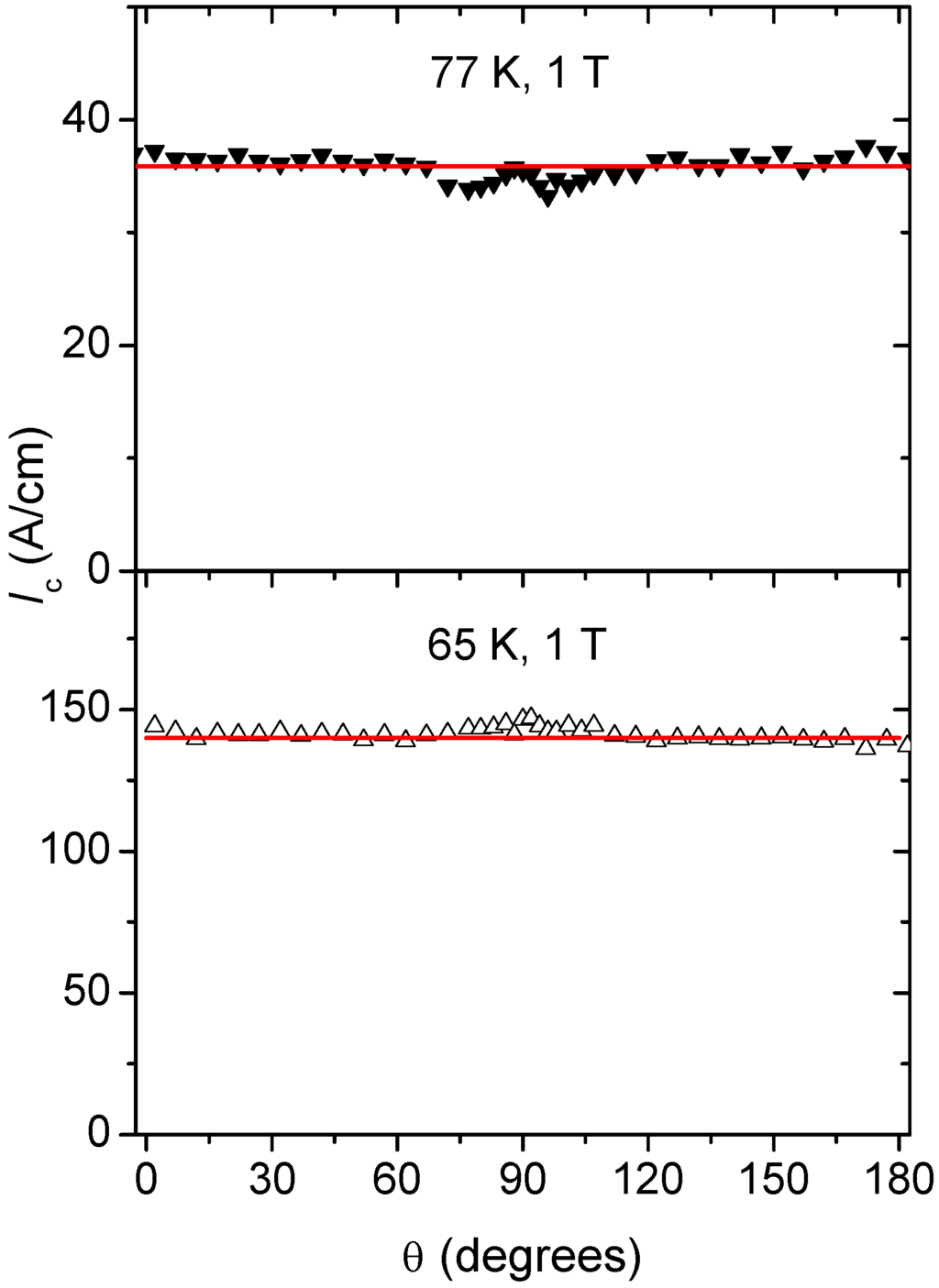 Isotropic Jc(θ) observed in an anisotropic high temperature superconductor YBCO, (a) 77 K, (b) 65 K, data (▼, Δ), fit ().