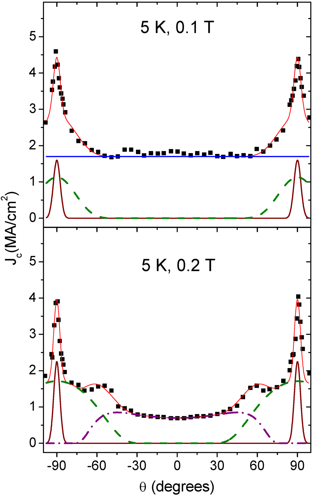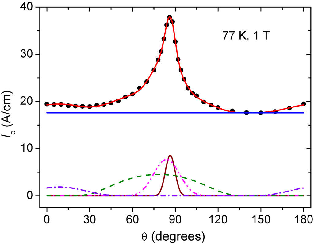 Jc(θ) at 77 K, 1 T for a commercial YBCO wire from SuperPower Inc.; experiment (●), full fit (), fit components (, , , , ). The fitting parameters for these data are summarized in Table 2. The center angle of each peak is also tabulated (NB. to fit Eqn. 3b substitute ).