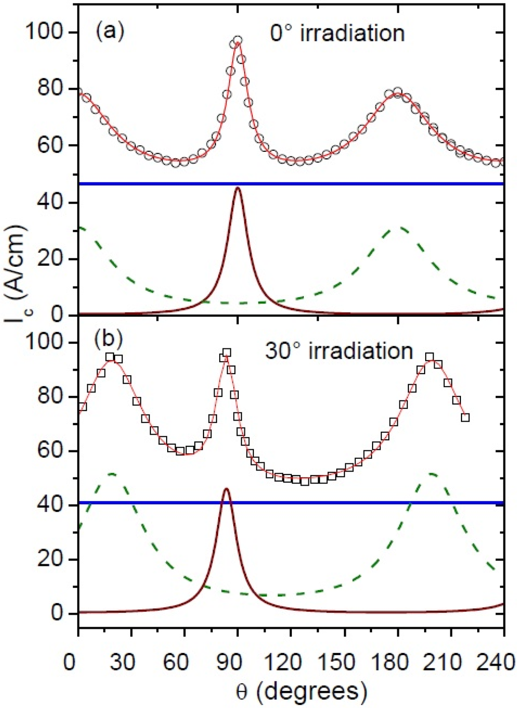 Jc(θ) at 77 K, 1 T for a YBCO thin film irradiated at (a) θ = 0°, (b) θ = 30° with Ag ions with areal density 1011 cm−2; experiment (○,□), full fit (), fit components (, , ). The fitting parameters for these data are summarized in Table 3. The center angle of each peak is also tabulated.