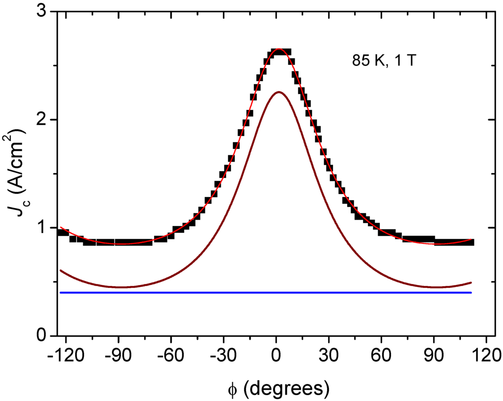 Jc(ϕ) at 85 K, 1 T for a YBCO thin film of thickness 500 nm. Data from []; experiment (■), full fit (), fit components (,). The fitting parameters for these data are summarized in Table 4.