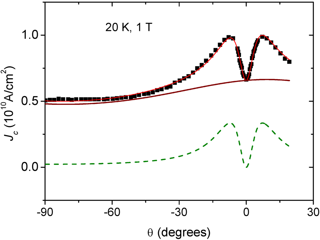 Jc(θ) at 20 K, 1 T for a YBCO thin film grown on a vicinal substrate with a 4° miscut angle. Data from [] experiment (■), full fit (), fit components (, ). The fitting parameters for these data are summarized in Table 5.