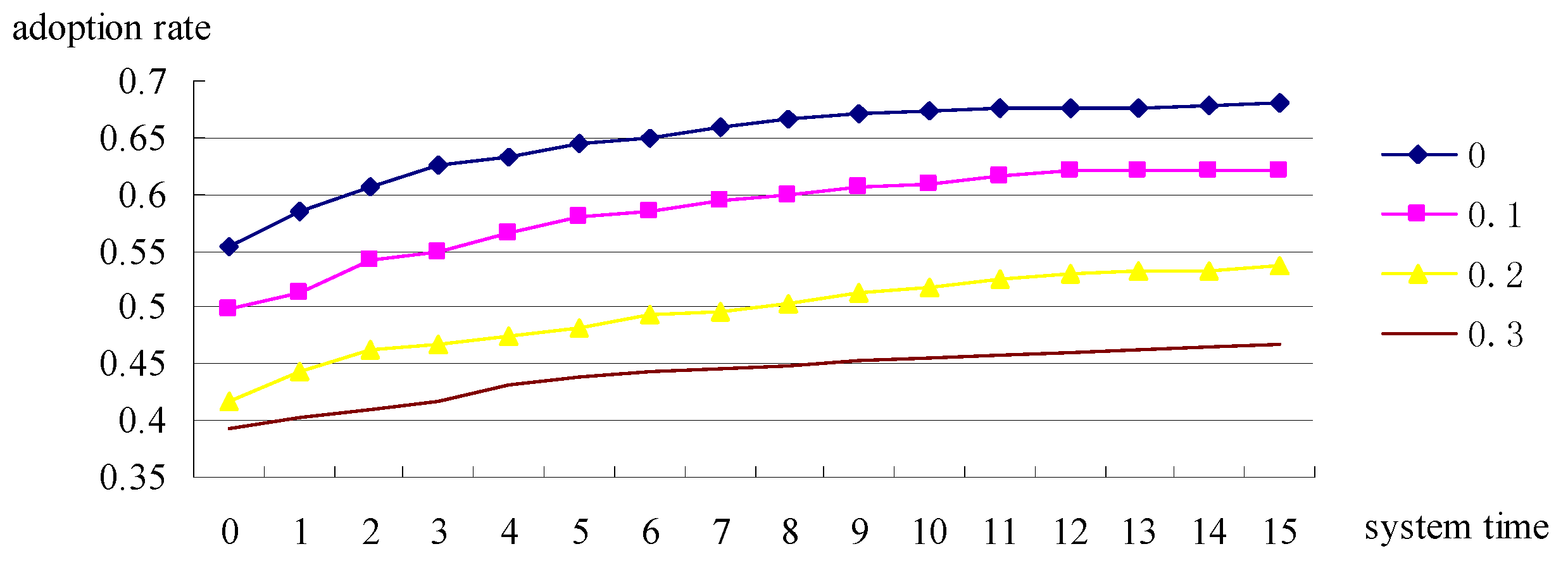 As Equation (1) shows, ai(0) accords with the standard normal distribution. For the purpose of comparison, we can make bi come from different normal distributions with different mean values (donated by m) and standard deviations (denoted by σ). The mean value and standard deviation of bi can reflect the mean cost level of innovation adoption and the level of individual differences respectively, so they uncover the ability of government and enterprises to control the cost of innovation diffusion and adoption from the macroscopic point of view. If the values of m and σ can affect the final adoption rate and adoption time, the finding will be useful for government and enterprises to develop tactics for optimizing the costs. It is noted that the endogenous variables ai(0)s are no need to be coped with as the bis do, because the ai(0)s can be changing with the system’s evolvement.