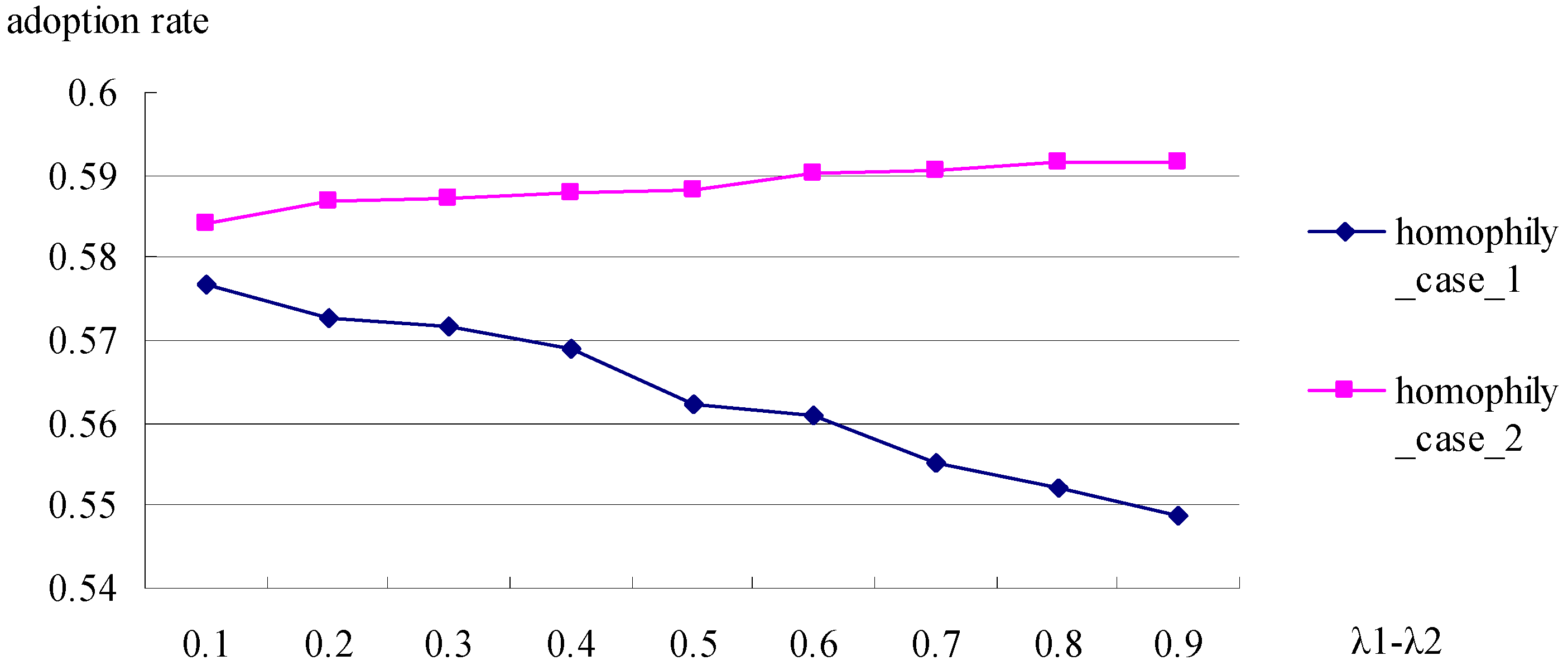 Adoption rate at different values of λ1-λ2 under two cases of homophily.