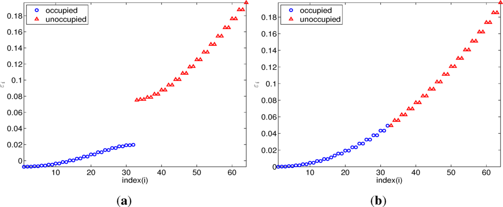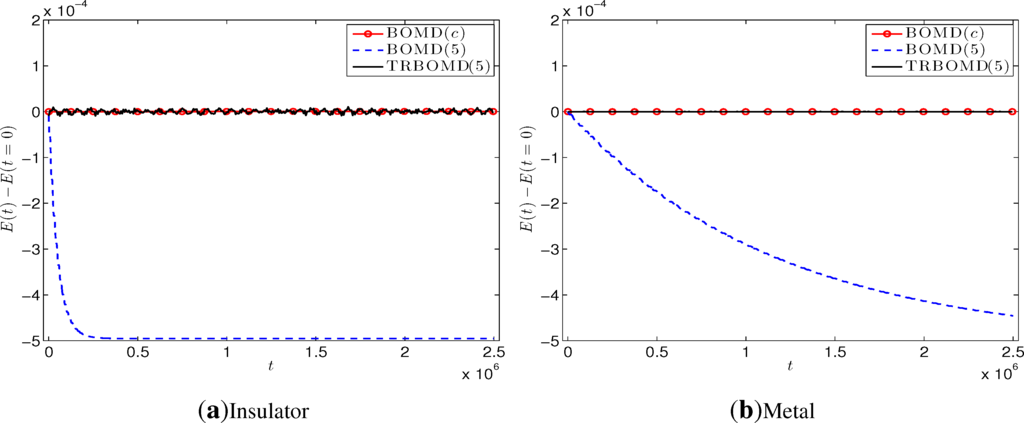 Note that condition (51) implies that CPMD no longer works if the system has a small gap or is even metallic. The usual work-around for this is to add a heat bath for the electronic degrees of freedom in CPMD [33], so that it maintains a fictitious temperature for the electronic degree of freedom. Nonetheless, the adiabaticity is lost for metallic systems, and CPMD is no longer accurate over long time simulation. In contrast, as we have discussed previously, TRBOMD may work for both insulating and metallic systems without any modification, provided that the SCF iteration is accurate and no resonance occurs. This is an important advantage of TRBOMD, which we will illustrate using numerical examples in the next section.