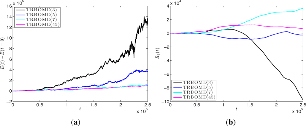 Let us remark that the above analysis is done in the linear response regime. As shown in [12,13], the accuracy of CPMD, in general, is only (μ1/2) instead of (μ) for the linear regime. Due to the close connection between these two parameters, we do not expect (ω−2) accuracy for TRBOMD in general, either. Actually, as will be discussed in Section 6, if the deviation of atom positions from equilibrium is not so small that we cannot linearize the nuclei motion, the error of TRBOMD in general will be (ω−1).