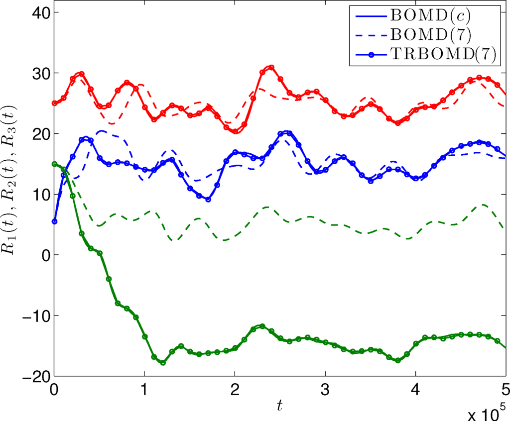Consider a system with M atoms and N electrons. The position of the atoms at time t is denoted by R(t) = (R1(t), …, RM(t))T. In BOMD, the motion of atoms follows Newton’s law:
