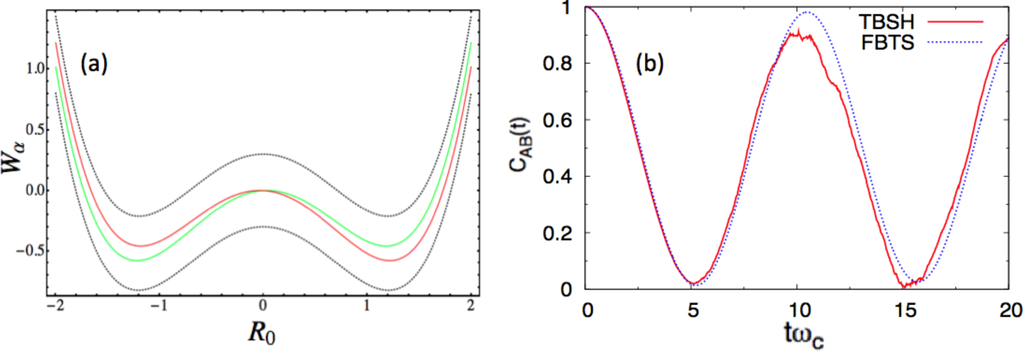 In this study, we report numerical results in the energy unit, ℏωc, and distance unit, , for each environmental DOF. We consider two sets of parameters. In the first case, we use the following parameter values, a = 1.0, ω0 = 1.2, γ0 = 0.05 γb = 1.0, Ω = 0.3, ξ = 0.1, ωmax = 3 and β = 0.2, in the dimensionless units. Figure 1a presents the potential surface profiles [53], Wα(R0). The two diabatic surfaces, WL,R(R0), remain close to each other, and the two adiabatic surfaces, W±(R0), share essentially the same characteristics. In this case, a mean-field-based algorithm, like FBTS, should be accurate and efficient. This problem can also be handled easily in the adiabatic basis, since the surface-hopping trajectories will be initialized in both the adiabatic ground and excited states, because the system is in a thermal equilibrium state at t = 0. Furthermore, the coupling parameter, γb, was purposely chosen to be small in order to minimize the number of nonadiabatic transitions (or hops) encountered in the TBSH algorithm. In panel (b), CLL(t) is computed using both algorithms. The agreement between these results is good.