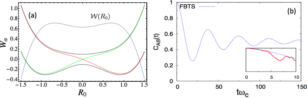 Next, we consider the following parameter set, a = 0.8, ω0 = 0.6, γ0 = 0.3 γb = 1.0, Ω = 0.1, ξ = 0.1, ωmax = 3, and β = 0.2 in the dimensionless units. Figure 2a shows the potential surface profiles, Wα(R0), obtained from this set of parameters. In this case, the adiabatic, W±(R0), and diabatic surfaces, WL,R(R0), only differ markedly near the region of the barrier top, where an avoided crossing point indicates significant mixing of the two diabatic states. Nonadiabatic effects should be most prominent near this barrier top. A stronger coupling, γ0, is also chosen in this case. Figure 2b presents the autocorrelation functions. In the main figure of panel (b), the blue curves (CLL(t) computed by the FBTS) start with the full correlation at one, then gradually reduce to 1/2, which implies that the subsystem is in an equal admixture of the two diabatic states in the asymptotic limit. The TBSH simulation results are only valid for very short times (as shown in the inset of the Figure 2b), due to instability arising from the accumulation of weights, even with filtering [54]. The thermal equilibrium distribution, (R0), has a bimodal distribution profile, as illustrated in Figure 2a; however, for the (inverse) temperature, β = 0.2, the double-peaked structure is very broad. The (R0) distribution profile (blue curve in Figure 2a) suggests that the thermal equilibrium state has a non-trivial contribution from the excited surface. Sampling from (R0) yields many R0 values near the barrier top, where several hops immediately take place for this strong-coupling case, and the instability sets in early in the simulation. Lowering β will produce a more pronounced double-peak structure for (R0), but the quartic oscillator’s momentum, P0, will fluctuate with a larger variance in the presence of the heat bath in this case. Since nonadiabatic transitions depend non-trivially on a = P0· d12(R0)Δt in the TBSH algorithm, large momentum fluctuations will eventually affect the long-time result. This case shows some of the practical limitations of the TBSH algorithm for the computation of this correlation function.