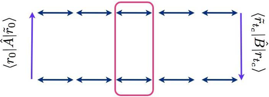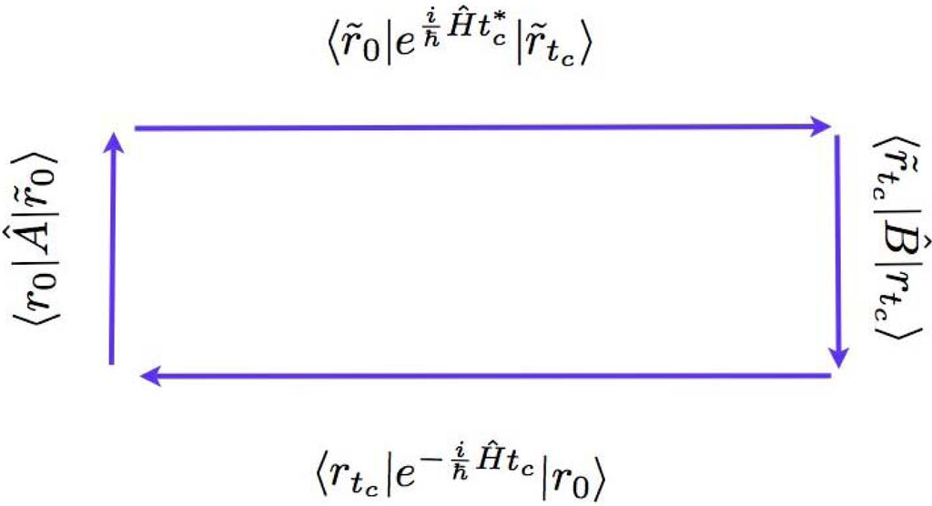 The structure of the integrand is represented in Figure 1 in which we show the sequence of matrix elements to be evaluated. Reading the figure from the bottom left corner up, we see the matrix element of operator Â, the backward complex time propagator (from r̃0 to r̃c), the matrix element of operator B̂ and, finally, the forward propagator that closes the circuit representing the trace operation. The difficult task is the evaluation of the propagators in complex time. To set the stage for the approximation we intend to perform, we use the time composition property to divide the two propagations into L segments of duration τc = tc/L (τc need not be infinitesimal) and rewrite, for example: