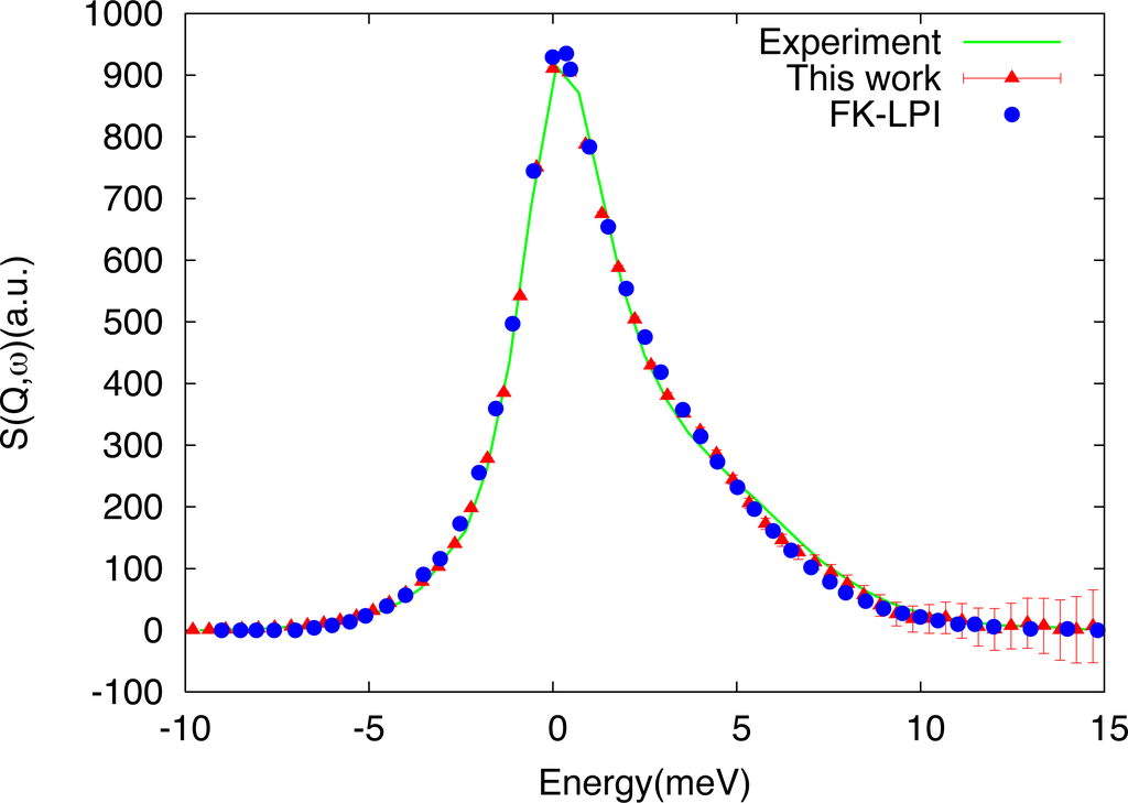 The computational overhead introduced by the auxiliary Monte Carlo calculation increases the cost of our calculation, but it is very small compared to the number of moves necessary to converge the estimate of Equation (20). The algorithm just described is, in fact, efficient enough to make possible calculations on realistic condensed phase systems with relatively little numerical effort. In particular, the algorithm was used to compute the dynamic structure factor of a model of liquid neon composed of 64 atoms [38]. Details of the calculation can be found in [38]. Here, we show, in Figure 4, our results (red triangles with error bars in the figure) and compare them with experiments (green curve) and the results of a calculation (with the same empirical potential and simulation parameters) performed by Poulsen et al. [45] using the linearized approximation for quantum time correlation functions described in the Introduction (see Equation (4) and the discussion above it).