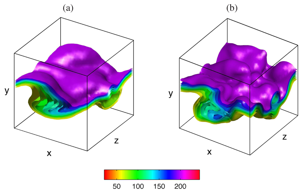 Isosurfaces of instantaneous filtered entropy in temporal mixing layer simulations at t = 80, predicted by (a) entropy filtered density function (En-FDF) and (b) direct numerical simulation (DNS).