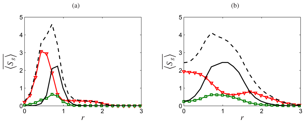 where μ is the fluid dynamic viscosity. In Equations (2)–(4), the second order SGS moments τ(a, b) = ⟨ab⟩L − ⟨a⟩L ⟨b⟩L appear as unclosed. In addition, the filtered chemical reaction source term, the last term on the RHS of Equation (3), and the filtered entropy generation terms, the last four terms on the RHS of Equation (4), require SGS modeling. The modeled filtered entropy generation terms must be positive semidefinite according to the second law of thermodynamics. It is important to emphasize that filtered entropy and entropy generation cannot be obtained from other filtered variables, because of their nonlinear dependency. Moreover, it is clear that having entropy alone is not sufficient to account for the individual processes contributing to its generation.