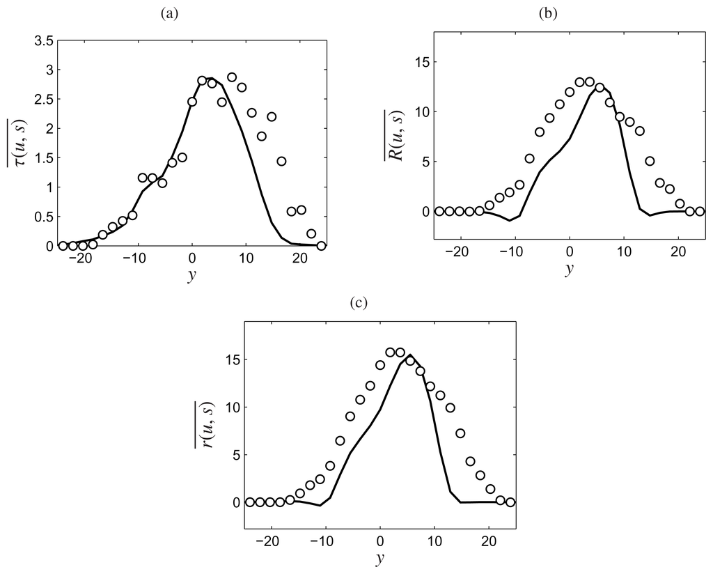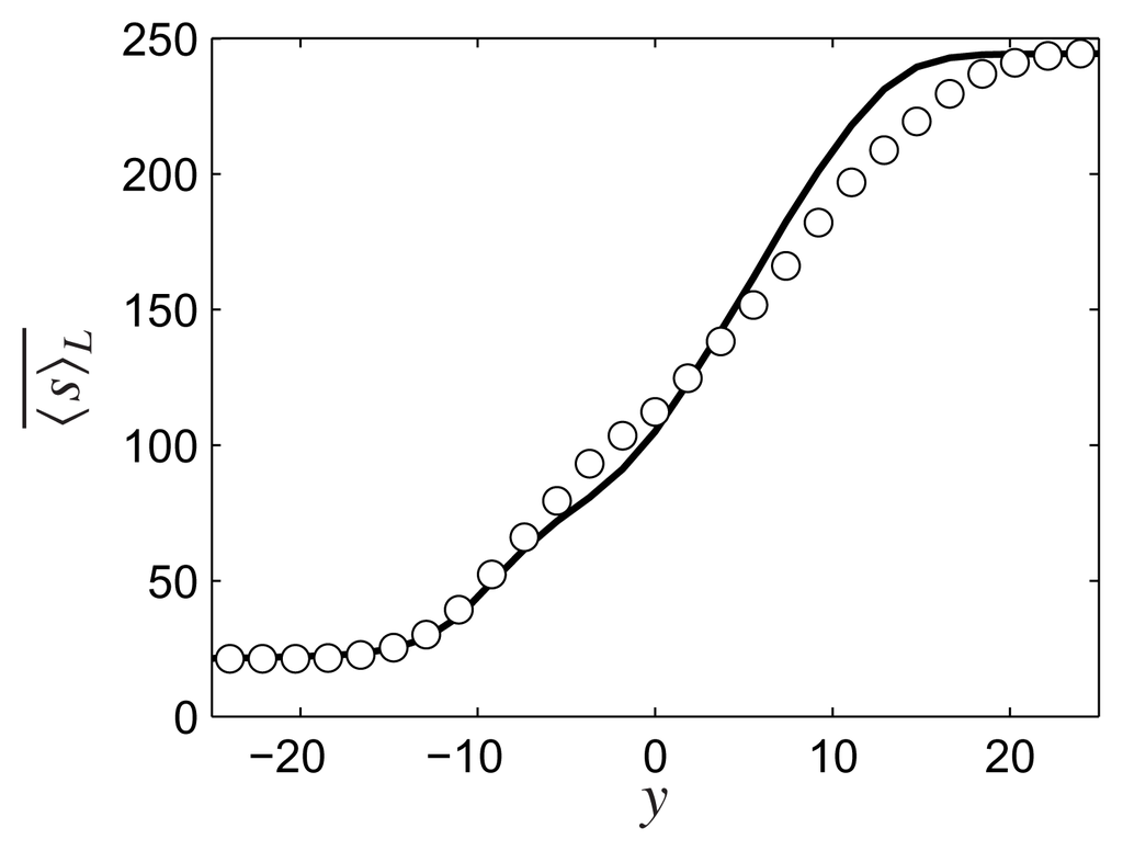 Figure 1 shows the formation of three-dimensional (3D) structures, visualized by the instantaneous filtered entropy fields obtained from the En-FDF and DNS. This figure shows a visual assessment of the methodology, as the large-scale coherent structures predicted by the En-FDF resemble those obtained from the DNS. Further appraisal is made by comparing the Reynolds-averaged statistics. These are constructed from the instantaneous data by spatial averaging over the homogeneous (streamwise and spanwise) directions and, hence, vary only in the cross-stream direction. The averaged quantities are denoted by an overbar. Figure 2 shows the close agreement of the Reynolds-averaged filtered entropy predicted by the En-FDF and DNS. To illustrate the En-FDF prediction of the second order SGS moments, the SGS, the resolved and the total entropy flux in the streamwise direction are shown in Figure 3. The resolved field is denoted by