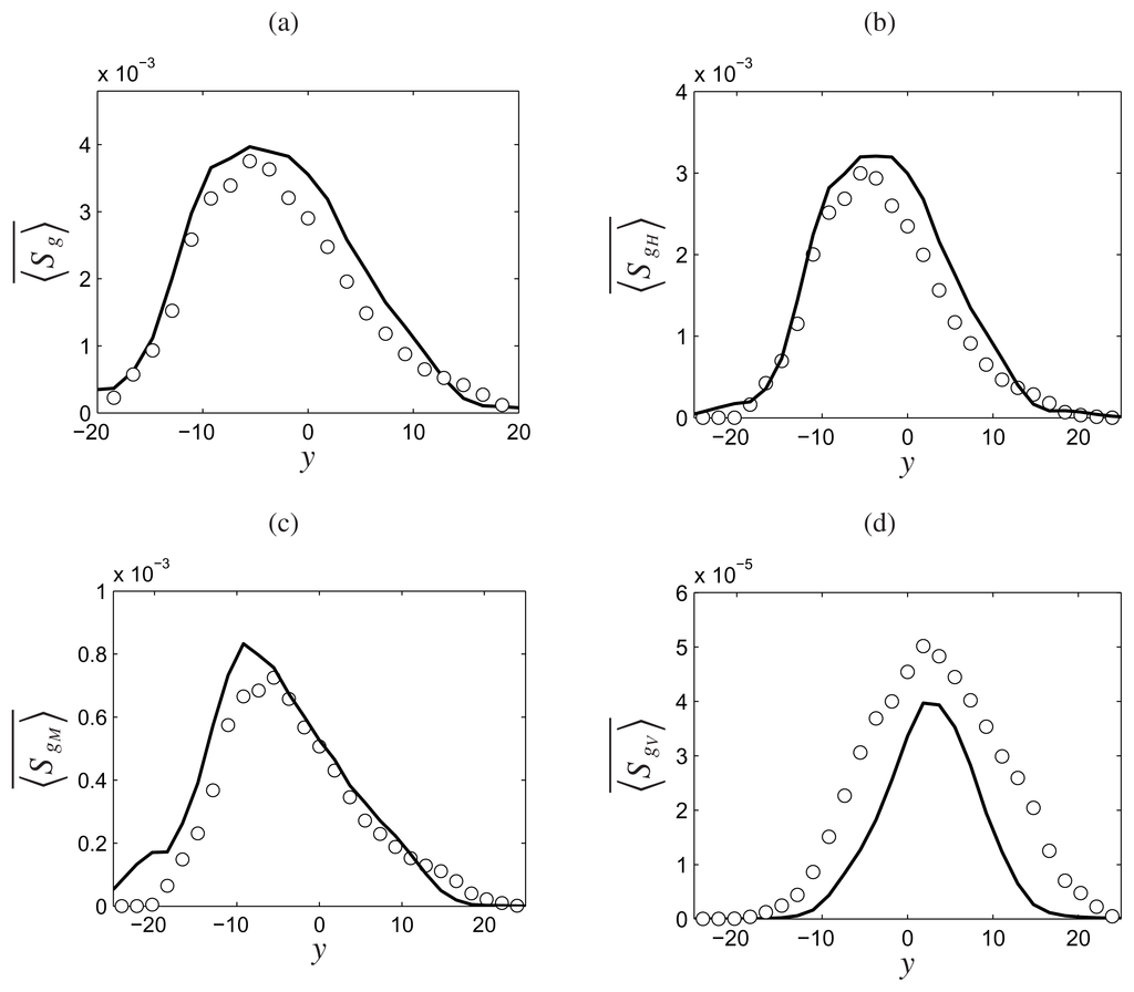 [72]. As shown, the streamwise entropy flux components are predicted well by the En-FDF. Similar agreements are obtained for other first and second order moments. The En-FDF is capable of accounting for individual filtered entropy generation effects. As shown in Figure 4, these are predicted favorably by the En-FDF. All mean entropy generation contributions peak in the fully turbulent region in the middle of the layer where the rate of turbulent mixing is the highest. The entropy generation by heat conduction is dominant in this flow, due to the large temperature difference across the layer, followed by that of mass diffusion. The effect of viscous dissipation is slightly underpredicted, due to underprediction of turbulent dissipation by the frequency model (Equation (8d)) [57]. However, the contribution of viscous dissipation to overall entropy generation is much smaller than that of other effects. These simulations show the favorable agreement of En-FDF results with the DNS data.
