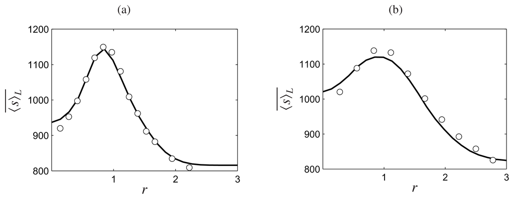 Radial variation of mean entropy in Sandia Flame D simulations at (a) x = 7.5 and (b) x = 15. The lines denote the En-FDF predictions. The circles denote the experimental data.