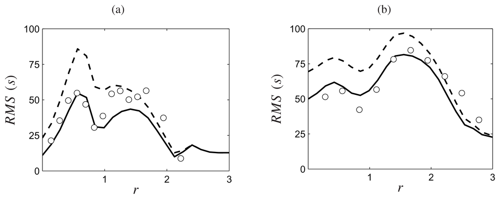 Radial variation of the RMS of entropy in Sandia Flame D simulations at (a) x = 7.5 and (b) x = 15. The solid and dashed lines denote the resolved and the total contributions, respectively. The circles denote the experimental data.