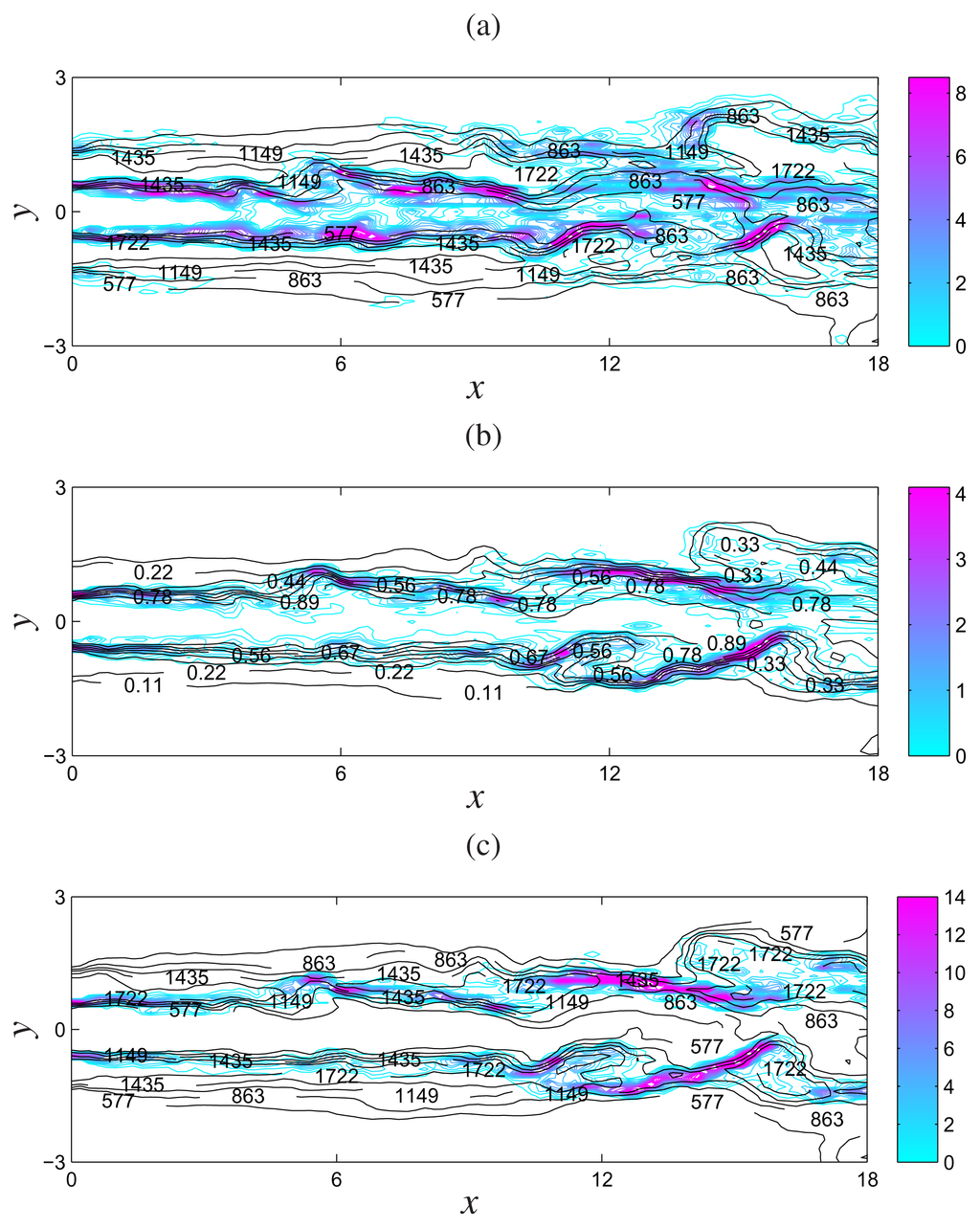 Instantaneous contours of entropy generation terms in Sandia Flame D simulations: (a) heat conduction (color) with temperature [K] (black) contours, (b) mass diffusion (color) with mixture fraction (black) contours and (c) chemical reaction (color) with temperature [K] (black) contours.