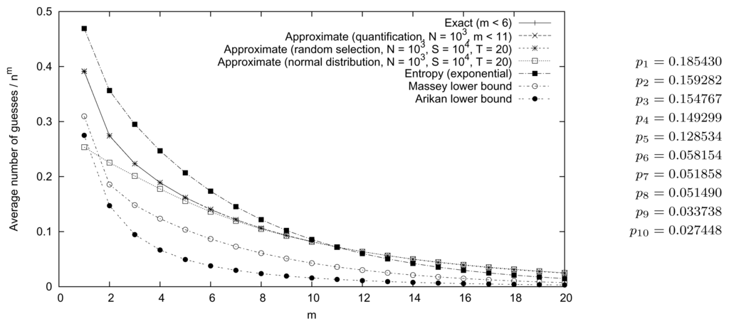 In Figure 1, the average number of guesses required for correctly guessing a word of size m using an alphabet of size 10 is given using various techniques. First, the exact solution is given (for m < 6). Second, three approximate solutions (as discussed in Section 3) are given (quantification using all probability products could be performed within reasonable time limits only for m < 11). Third, an estimate based on entropy (Equation (7)) is provided. Fourth, lower bounds derived by Massey (Equation (5)) and Arikan (Equation (6)) are included.