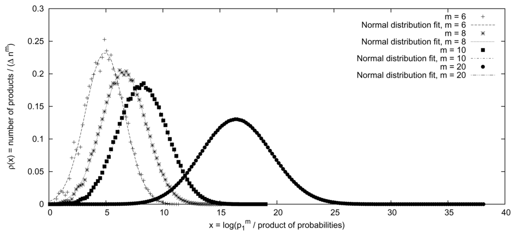Another interesting approach is given by the central limit theorem in probability theory, which roughly states that the mean of a large number of independent stochastic variables is approximately normally distributed. In Figure 2, the density of the logarithm of products of probabilities for the randomized probability distribution given in Figure 1 is displayed. The density fits nicely to a normal distribution, with a better fit for larger values of m (the number of independent stochastic variables). As expected, the average value is proportional to m and the standard deviation to