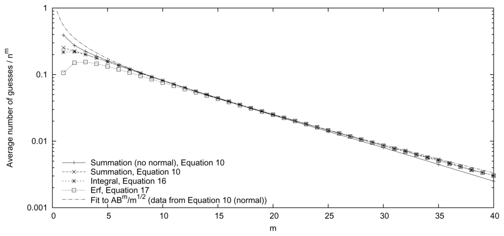 As is illustrated in Figure 1, the approximate techniques of quantification (N = 103) and random selection (N = 103, S = 104 and T = 20) may provide accurate estimates of guesswork (with a reasonable amount of storage and CPU time). The third approximate technique (using a normal distribution) (N = 103, S = 104 and T = 20) demonstrates accurate estimates for large values of m (>6) in accordance with the central limit theorem. By using a fitting procedure for values in the range 9 ≤ m ≤ 40, an approximate expression is given by G1/nm ≈ 0.592 · 0.920m · m−1/2 (see Figure 3). By evaluating the leading term of Equation (17) (see Equation (18)), the expression 0.832·0.912m·m−1/2 is obtained.