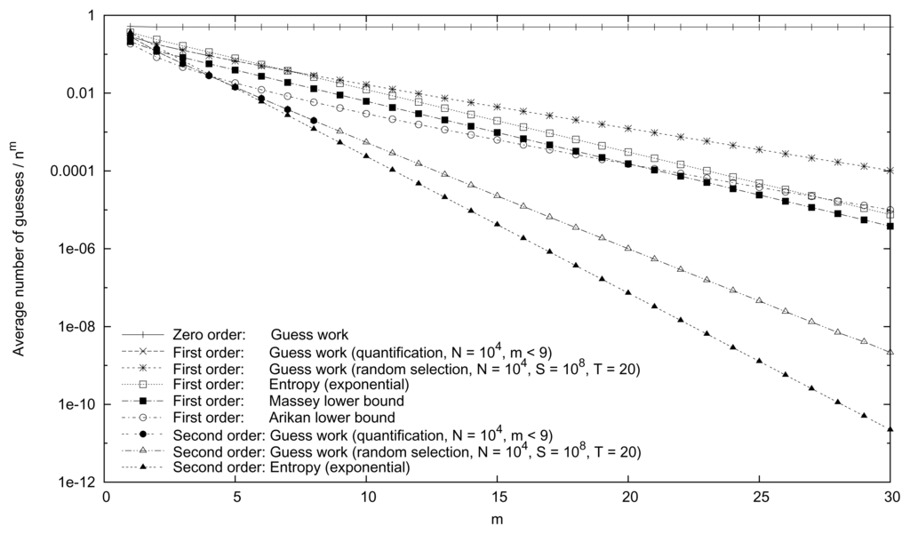 Using the same procedure as in Section 4.1, the error introduced when randomly selecting probability products can be estimated. In first order, a 99% confidence interval for the guesswork is given by Equation (14), and by using the data in Figure 4, the error (R1) is determined to be between 0.006% and 0.05% (depending on the m value). This should be added to the error of 0.02% introduced by quantification. In second order, exactly the same procedure can be used, and then, the error is estimated to be in the range 0.006% and 6% (depending on the m value). Again, this error should be added to the error of 0.04% introduced by quantification. The large error introduced by random selection in second order for large m values is due to the fact that the fraction of probability products that are zero is larger for larger m values. By randomly selecting S · m probability products, the number of non-zero probability products is decreasing with an increasing value of m. To increase the accuracy of the guesswork estimate in second order, another m dependence of the number of selected probability products has to be chosen.