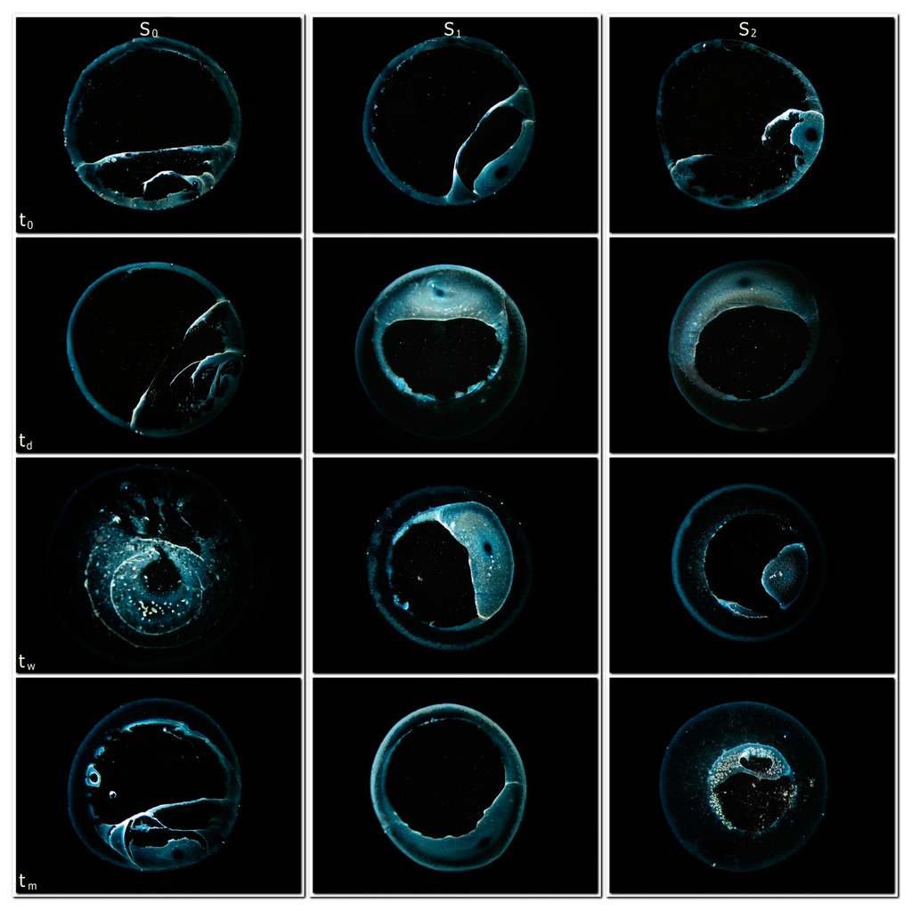 Typical DRP images of the chosen spring water. Images depict treatments with three different surface sizes—Sj (S0—no glass beads, S1—filled with 10 mm glass beads, S2—filled with 3 mm glass beads; see Table 2) at four different times—ti (t0—after 1 hour, td—after 1 day, tw—after 1 week, tm—after 1 month). Dark-field microscopy; 40× magnification.