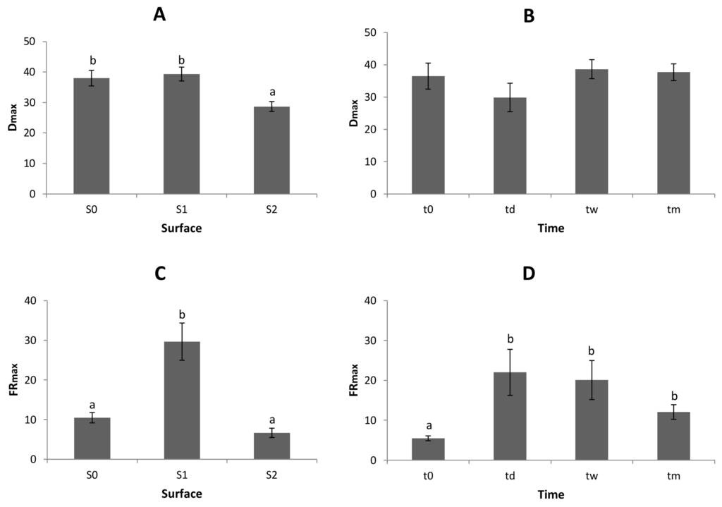 Effect of surface (Sj—see Table 2 for explanation) and time of incubation (ti—see Figure 1 for explanation) on Dmax (A and B) and FRmax (C and D). Averages ± standard errors are presented. Different upper-case letters on (A) indicate significant differences according to Duncan’s multiple range test (p < 0.05). Different letters over the bars on (C) and (D) indicate significant differences in medians according to Kruskal–Wallis test (p < 0.05).