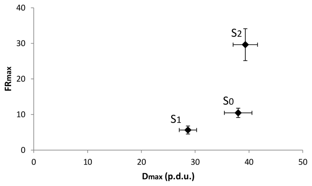The analogous results concerning FRmax also yielded statistically significant results in the Sj domain, as revealed by Kruskal–Wallis test of medians (p = 0.001, see Figure 2C). A significant difference was observed between S0 and S1 on one hand as well as between S1 and S2 on the other. Surface S1 demonstrated a much higher average frequency than either S0 or S2. Even though the result seems to be a bit misleading, it clearly delineates S1 from S2, with S0 in between (closer to S2). It also seems that a high S (S1) determines a high Dmax and a high FRmax, while a very high S (S2) influences the evaporation in the direction of very small distances as well as very small frequencies (Figure 3).