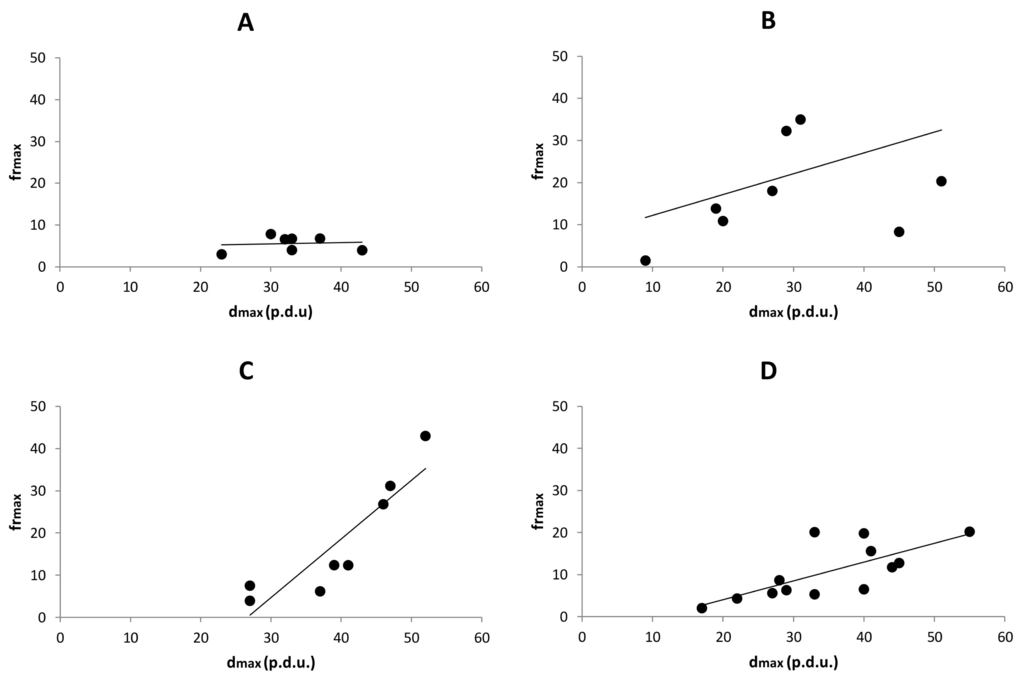 Taking all these results into account, we can conclude that the DRPs demonstrate differences in either Sj or ti domain via at least one parameter. But there is still no clear evidence as to whether some hidden order comes to the fore through time or via S/V-ratio. To clarify this important issue, we calculated the dependence between the two parameters: dmax and frmax with linear regression analysis. We assumed that the dependence is based on two factors: the correlation between the two parameters and the significance of the given linear regression line.