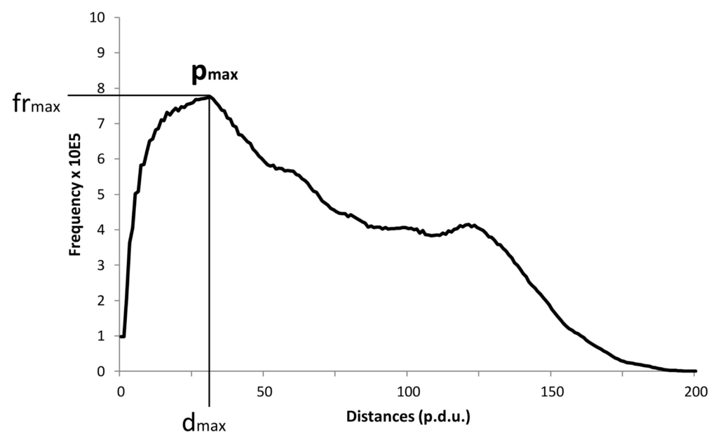 Thus we have two variables at our disposal for every graph: the distance (dmax) and the frequency (frmax). The parameter dmax therefore represents the distance at the maximal frequency (frmax). In order to seek out statistical differences among the various groups, we had to group all pertaining distances (dmax) and frequencies (frmax) based on Sj or ti. We designated the averages of these treatments as Dmax and FRmax; for instance since there are three Sj we have three Dmax values and three FRmax values (grouping triplets from all given incubation times—ti).