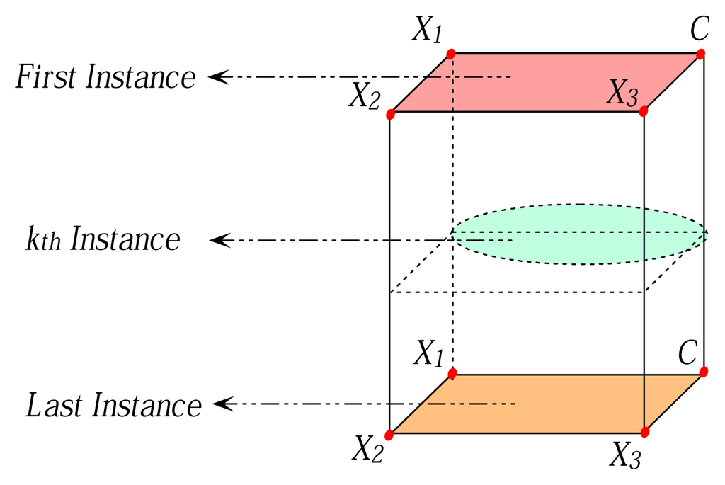 Mutual information and conditional mutual information are commonly applied to roughly describe the direct or conditional relationships between predictive attribute and class label C. However, in the real world, the relationships between attributes may differ greatly as the situation changes. Local mutual information and conditional local mutual information can be used to describe the dynamic changes, thus making the final model much more flexible. For example, as Figure 1 shows, suppose that the overall relationship among attributes {X2, · · ·, X3} and class label C is just like a rectangle. However, for the k–th instance, {X2,X3} are independent of C, and the local relationship between X1 and C is just like an oval.