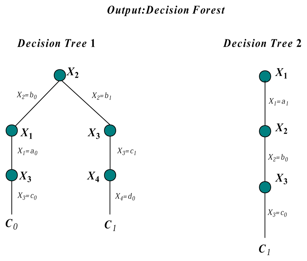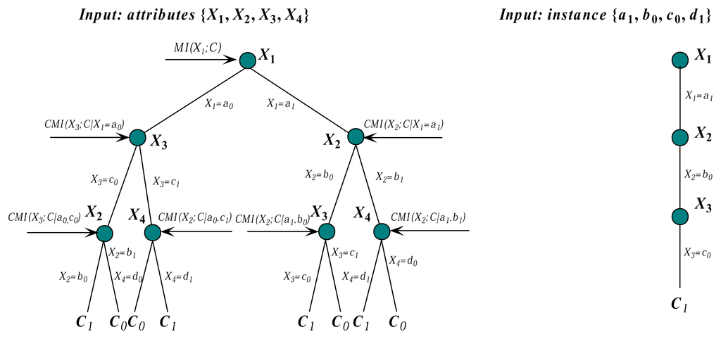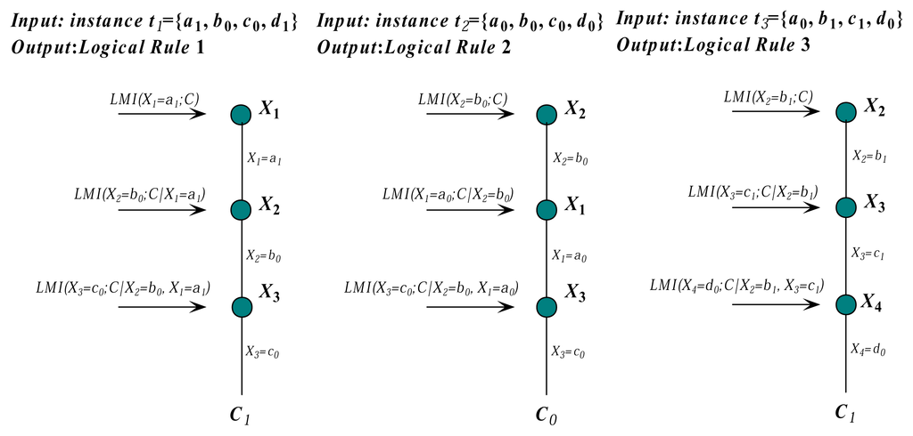 On the basis of the chain rule of local mutual information described above, we can convert each instance into a single logical rule or decision path. We first choose the most appropriate attribute value from t, e.g., x1, which satisfies LMI(C; x1) = max LMI(C; xi)(1 ≤ i ≤ n). The training set is split into finer subsets with attribute value x1. Then, we choose the next attribute value, e.g., x2, which satisfies CLMI(C; x2|x1) = max CLMI(C; xi|x1)(1 ≤ i ≤ n, i ≠ 1). The training subset is further split into finer subsets with attribute values x1 and x2. This procedure will continue, until the class label of the subset is the same or the instances in the subset satisfy some criterion. Finally, each training instance corresponds to a logical rule or decision path. If several rules have the same root, the combination of these rules with the same root node can build a complete decision tree, and the same part of the structural information present in the data can be expressed. Thus, the final model is composed of not one tree, but one forest. This technique reduces the potential for overfitting and overtraining and improves the prediction quality and generalization. For example, given attributes X = {X1,X2,X3,X4} and three instances {t1, t2, t3}, according to the comparison results of local mutual information and conditional local mutual information instances, {t1, t2, t3} can be converted into three logical rules. The conversion procedure are shown in Figure 2.