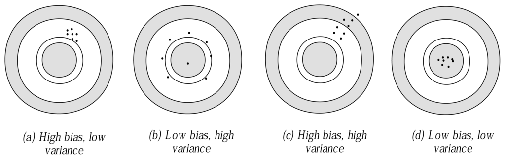Moore and McCabe illustrated bias and variance through shooting arrows at a target [16], as described in Figure 6. The perfect model can be regarded as the bull’s eye on a target and the learned classifier as an arrow fired at the bull’s eye. Bias and variance describe what happens when an archer fires many arrows at the target. Bias means that the aim is off and the arrows land consistently off the bull’s eye in the same direction. Variance means that the arrows are scattered. Large variance means that repeated shots are widely scattered on the target. They do not give similar results, but differ widely among themselves.