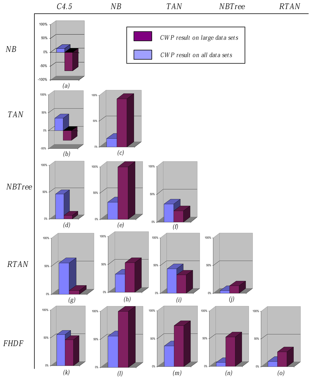 If CWP > 0, then the classifier performs better. Otherwise, it performs worse. Figure 7 shows the comparison results of CWP corresponding to Tables 7 and 8.