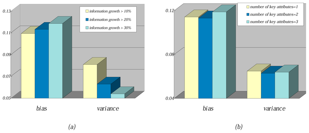 To further describe the working mechanism of FHDF, the information growth and the number of key attributes are changed while learning from training data. The comparison results of average bias and average variance are shown in Figure 8. When information growth increased from 10% to 30%, as can be seen from Figure 8a, the bias increased correspondingly, while the variance decreased. The main reason may be that if instance t needs to be converted into the classification rule, higher information growth will cause fewer attribute values to be selected. Thus, the classification rule will be too short to precisely fit instance t. However, when given different training data, the short rule may roughly hold for many instances. When the number of key attributes increased from one to three, as can be seen from Figure 8b, the bias and variance almost remain the same. With more key attributes used, according to Occam’s razor rule, the extracted FDs may be coincidental and not credible. Furthermore, the number of FDs with one key attribute are much more than those with two or three key attributes; the negative effect on bias and variance can be neglected.