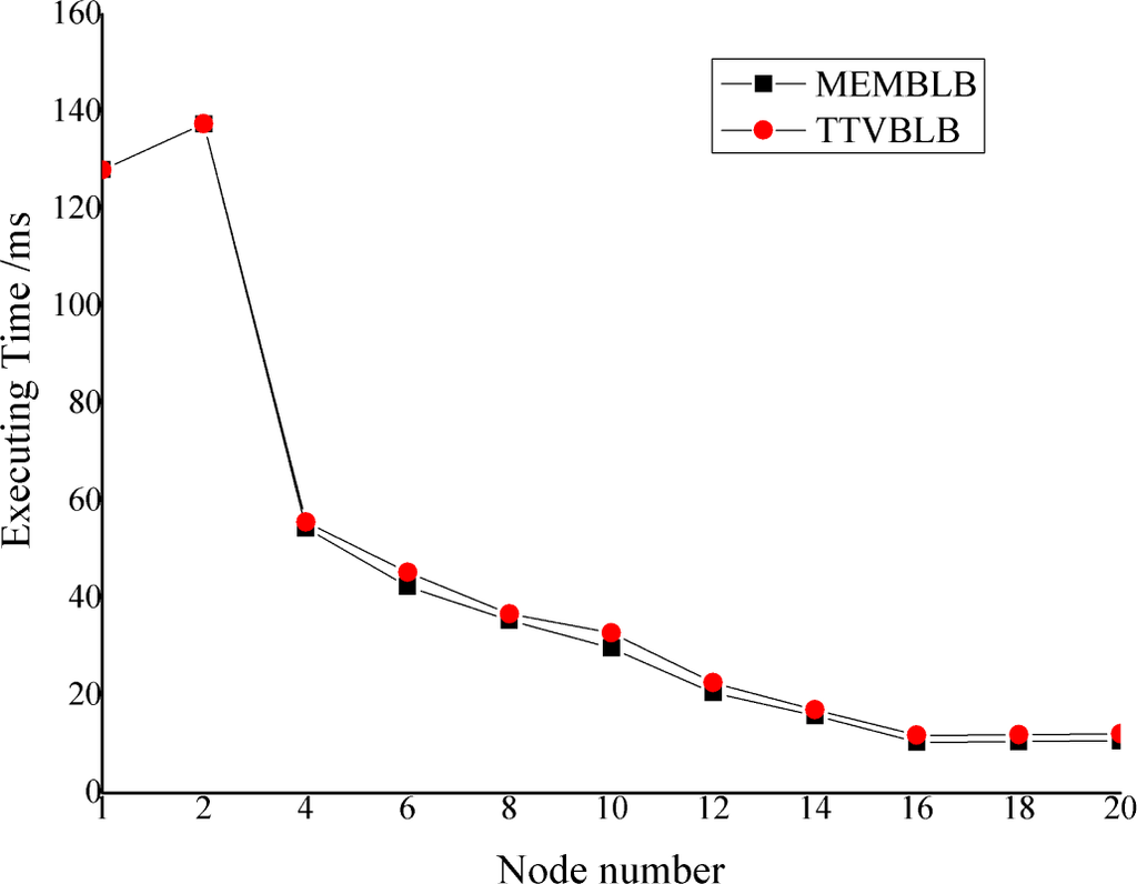 As can be seen from Figure 1, that with the increasing number of nodes in the cluster, the program execution time is reduced. When there are two nodes, it means that there is only one computing node, and the program execution time is slightly longer than the serial program because of the cost of the load balancing algorithm. With an increasing number of nodes, there is more migration and the cost of load balancing increases, but the increasing number of nodes does not affect the program execution time much, which even does not rise and instead falls. When the node number is 16, the MEMBLB algorithm’s program execution time has reached its lowest point (10.4 ms), while the TTVBLB algorithm’s program execution time is 11.8 ms, so the MEMBLB algorithm will reduce the minimum execution time by approximately 11.9%.