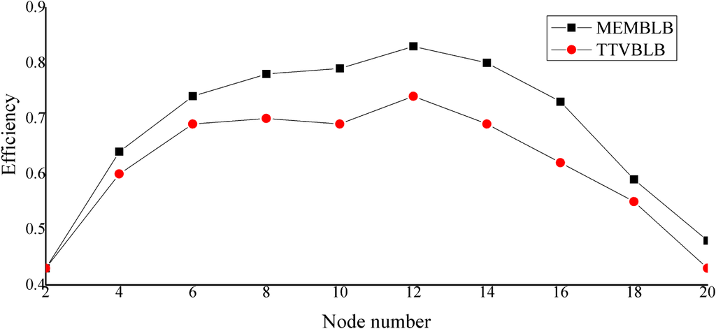 Secondly, Figure 2 shows how the efficiency of the two algorithms changes with node number. It is seen that the MEMBLB algorithm’s maximum efficiency is 0.83, while the TTVBLB algorithm’s is 0.74, so the MEBLB algorithm raises the maximum efficiency by about 22.9%.