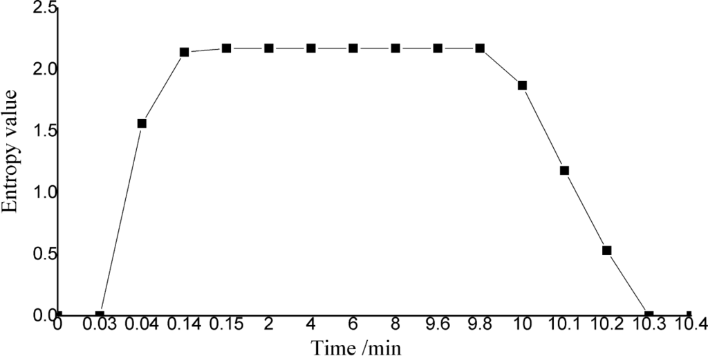 At the starting stage of the system, the time when the load starts to be scheduled, the load distribution of the cluster is not balanced, so the value of the entropy is smaller. The load is assigned evenly to each server as time passes by, so the system reaches balance and the value of the entropy reaches the maximum. However, due to the difference of tasks, some servers will have completed their tasks while others are still running, which will destroy the balance. Then the load distribution of the system won’t be balanced, and the value of the entropy will decrease gradually.