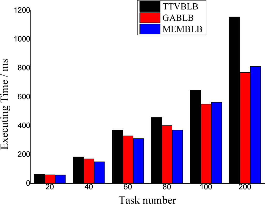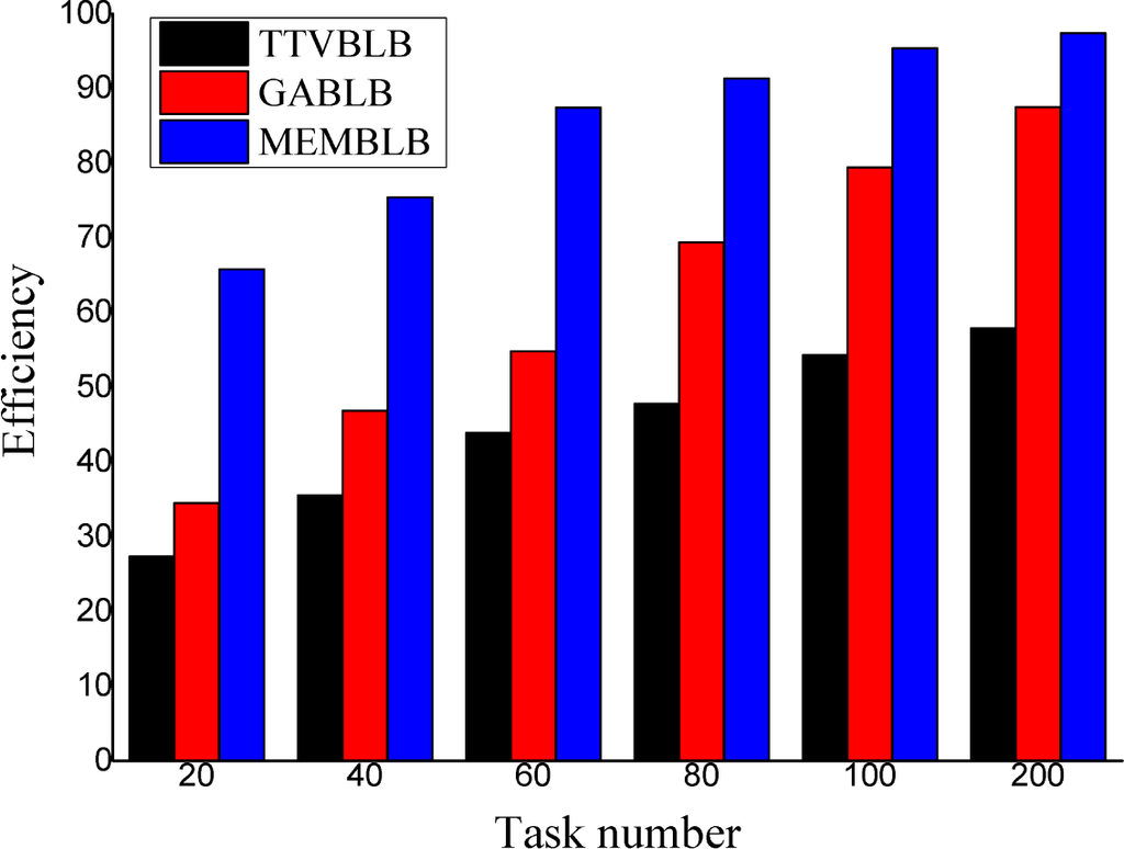 As can be seen from Figure 4, the TTVBLB algorithm’s program execution time is always the longest one, and the gap between them widens with task number. When there are fewer tasks, the MEMBLB algorithm’s program execution time is shorter than that of the GABLB algorithm. However, as the number of tasks increases, the MEMBLB algorithm’s program execution time is longer than that of the GABLB algorithm, but not that much more. Secondly, Figure 5 shows how the efficiency of the three algorithms changes with task number. It is seen that the MEMBLB algorithm’s efficiency is always the highest, which means that the MEMBLB algorithm can make the system load balancing more effectively than the other two algorithms.