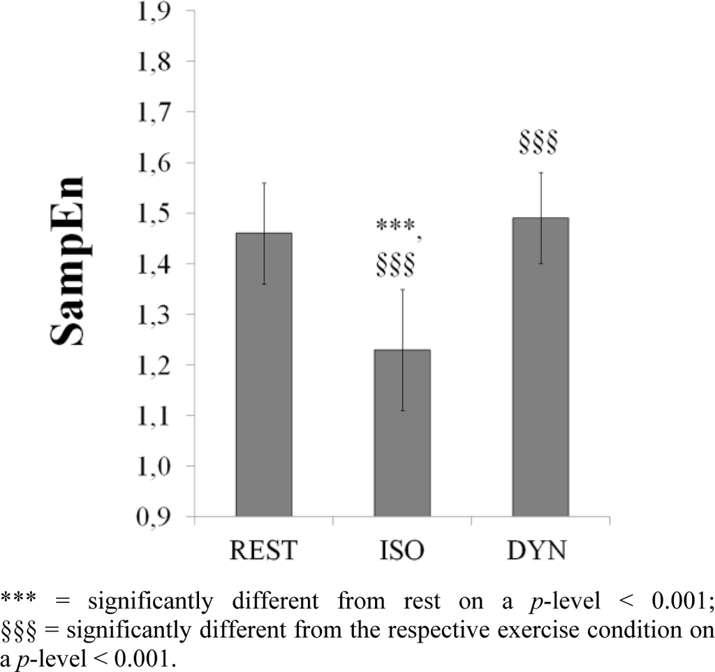 Inter-beat (R-R) intervals of the participants were measured at rest (REST) and during two exercise sessions of five minutes: dynamic contractions (DYN) and isometric contraction (ISO) of the lower limbs. Data presented here, were pooled from two single experiments. The first experiment consisted of two-legged DYN and ISO exercise. The experimental setup is described elsewhere []. The second experiment consisted of one-legged DYN and ISO of the right M. quadriceps femoris using a CYBEX NORM dynamometer (Computer Sports Medicine®, Inc., Stoughton, MA, USA). DYN and ISO were performed in a randomized order. Between the respective exercise sessions a recovery phase not less than 10 min served as a washout period to prevent carryover effects. Exercise intensity of the first exercise treatment (DYN or ISO, respectively) was regulated to reach a significant, but moderately increased HR steady state. Intensity of the following exercise session was regulated to match a similar HR level. Forreal-time HR monitoring and the measurement of R-R intervals a Polar® HR monitor with an accuracy of one millisecond [,] was used. All experimental periods included the measurement of SBP and DBP using the automatic blood pressure (BP) measuring device Bosotron 2, (Boso Inc., Jungingen, Germany) []. Mean arterial pressure (MAP) was calculated by (SBP + 2 × DBP)/3; rate pressure product (RPP), a measure of myocardial oxygen consumption, was calculated by SBP × HR. To ensure steady state conditions only the last three minutes of each session were analyzed []. HR (beat-by-beat) was averaged for the three minutes. BP was measured in the last minute of each exercise session. A short term HRV-analysis was performed for three-minute beat-to-beat (R-R) interval segments during steady-state conditions. R-R series were processed using the free software Kubios HRV 2.1 (University of Kuopio, Kuopio, Finland). All analyzed R-R time series exhibited low noise (rate of erroneous R-R intervals below 5%). Before the computation, R-R time series were corrected for artifacts, using adaptive filtering, and detrended (detrending method: smoothn priors, λ = 500). Time domain measures SDNN and RMSSD, spectral power in the low (0.04–0.15 Hz, LFP) and high (0.15–0.4 Hz, HFP) frequency range and their relative values (% HF = HFP/TP (total spectral power) and % LF = LFP/TP). HFP is predominantly modulated by vagal outflow to the heart whereas LFP is supposed to be modulated by both autonomic branches. % LF is thought to reflect the sympathetic drive to the heart [–]. SampEn was used to assess the complexity of the HR “signal” under the different conditions [–]. SampEn measures the likelihood that runs of patterns that are close to each other will remain close in the next incremental comparisons [,]. Its calculation relies on counts of m-long templates matching within a tolerance r that also match at the next point. For SampEn calculation the value of m was selected to be m = 2, for tolerance r a fraction of the standard deviation of the R-R data (r = 0.2 * SDNN) was chosen []. Low entropy values arise from extremely regular time series, higher values reflect more complexity, and highest values are typical for stochastic data sets [–].
