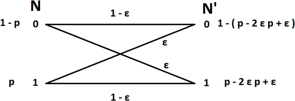 Now we consider the measurement error as the probability to miss-assign a spike to a neuron. Considering the high accuracy of modern techniques we assume that this probability is small. This means that when a neuron fires with probability P(N = 1) = p the probability of falsely assigning this spike to another neuron, and thus not assigning a spike to the firing neuron, is the conditional probability P(N′ = 0 | N = 1) = ε, and the probability of correctly assigning a spike to the firing neuron is P(N′ = 1 | N = 1) = 1‒ε. Similarly when a neuron does not fire P(N = 0) = 1 ‒ p the probability of a false positive, i.e., that a spike from a different neuron will be assigned to it is P(N′ = 1 | N = 0) = ε and the probability of correctly not assigning a spike to the neuron is P(N′ = 0 | N = 0) = 1 ‒ ε.