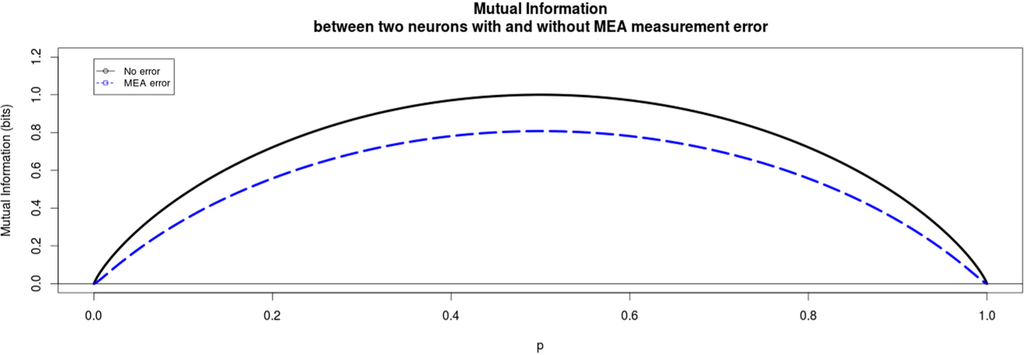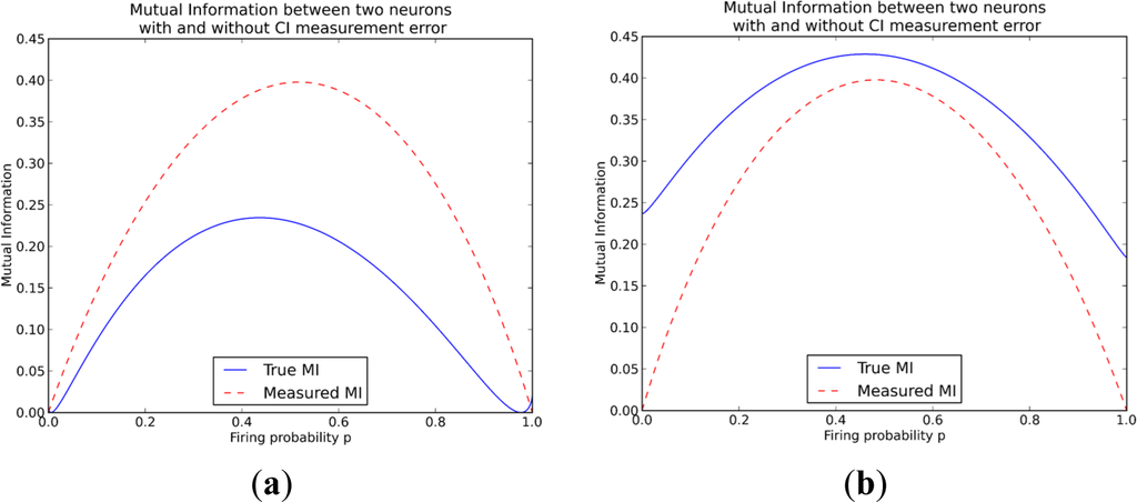 From the previous section it is clear that MEA and CI each will have a different type of error in the measurement of neuronal activity. MEA measures spikes accurately in the temporal dimension but cannot measure directly which neuron generated the spike; CI measures accurately which neuron generates a spike, but may miss consecutive spikes due to the temporal “smearing” effect. We develop two simple models of the measurement error induced by the MEA and CI techniques and study numerically their impact on the measured pairwise mutual information between two neurons. We focus on pairwise mutual information because many derived information-theoretical measures can be written as a sum of (conditional) pairwise terms.
