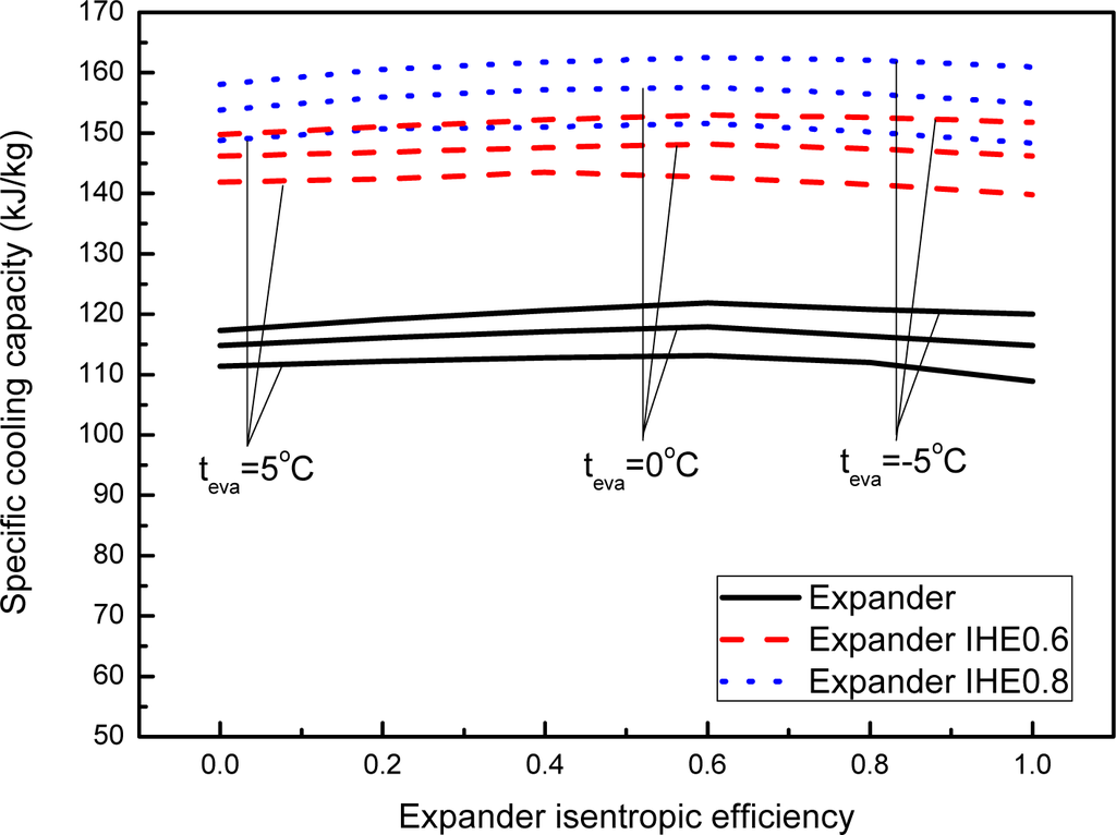 Specific cooling capacity versus expander isentropic efficiency at different evaporating temperatures.